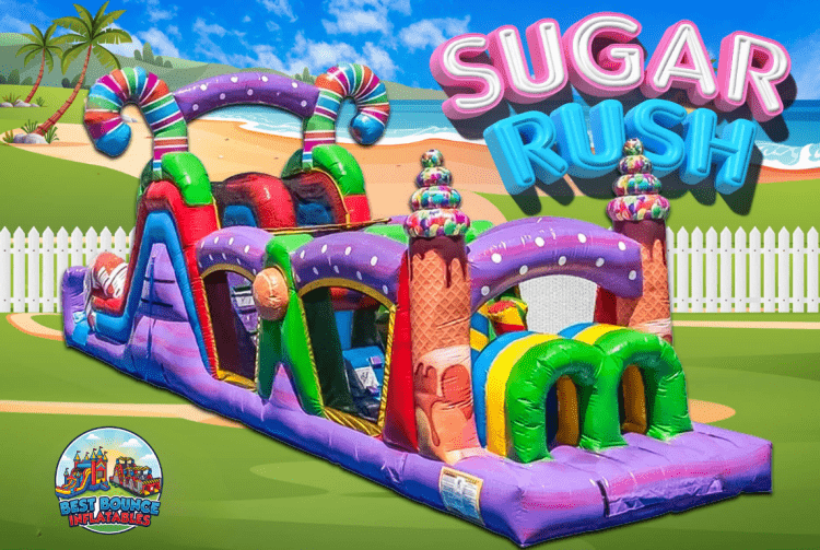 Take your next party or event to the next level with Bounce House Atlanta's 47' Sugar Rush Obstacle Course with Dual Lane Slide! This inflatable obstacle course is filled with excitement from its bright, cheerful colors to its dual lane slides and climbing wall. Plus, it has a built-in pool stopper at the bottom for extra fun and wetness! Get ready for an unforgettable day of fun with Bounce House Atlanta's 47' Sugar Rush Obstacle Course with Dual Lane Slide. It's sure to be a hit at any gathering!